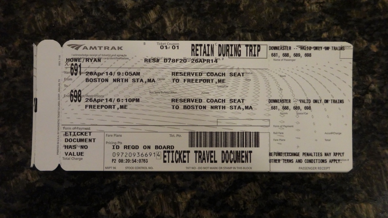 The trip finally was able to happen after all the planning from Part 1. On Saturday April 26th, 2014 Dad, Debora and I were able to drive into Boston to take the Downeaster Amtrak train from North Station in Boston to Freeport ME.